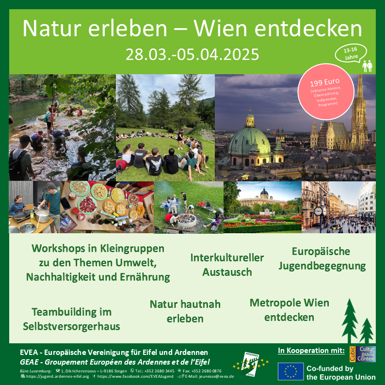 Vom 28. März bis 5. April 2026 kommen Jugendliche aus Luxemburg, Rheinland-Pfalz und Österreich zusammen, um gemeinsam Österreich zu erkunden, neue Freundschaften zu schließen, Natur zu erleben und Großstadtluft zu schnuppern.